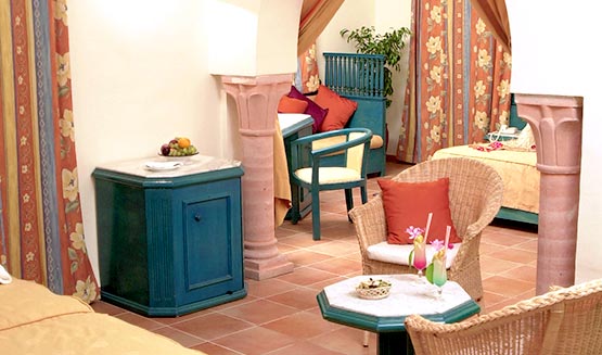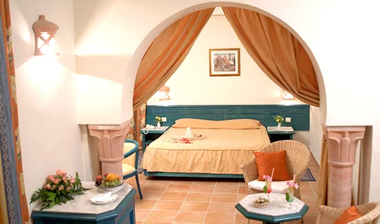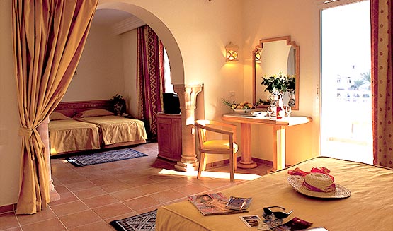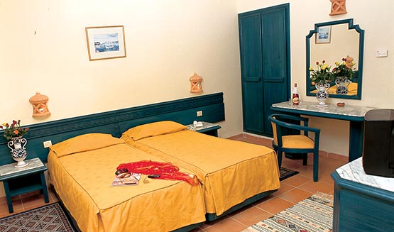 L’Hôtel dispose de 285 chambres aménagées en lit double, triple ou quadruple dont 92 chambres sont réparties autour d’un patio de menzels à l’architecture traditionnelle. Toutes les chambres disposent de salle de bain, dressing, coiffeuse, coin fauteuil, loggia ou terrasse en offrant toutes les commodités téléphone, Télé satellite, sèche cheveux, chauffage et climatisation.